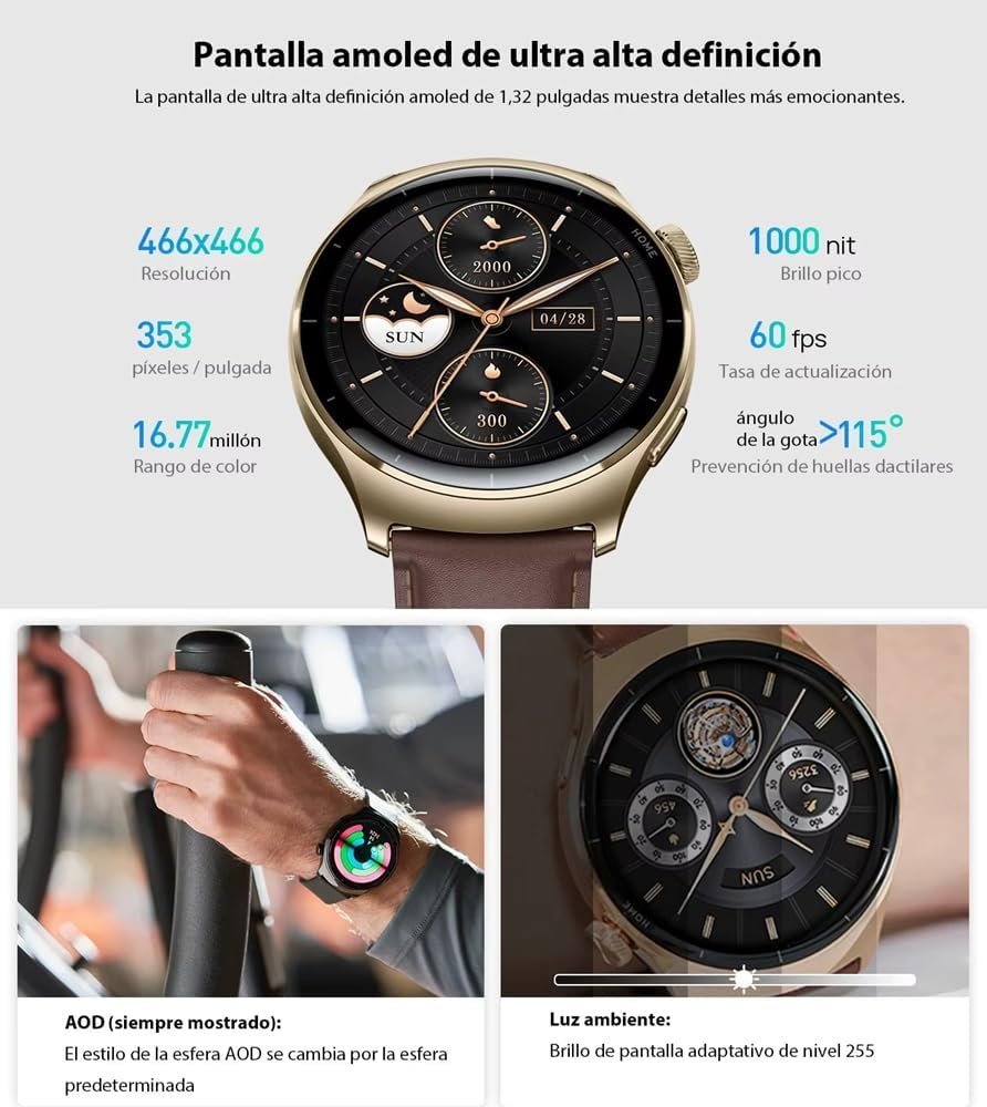 شاشة AMOLED UHD بحجم 1.32 بوصة بدقة 466×466 بكسل مع سطوع عالي يصل إلى 1000 nit و معدل تحديث 60 FPS مع دعم Always‑On Display (AOD) لعرض الوقت والمعلومات بشكل دائم.