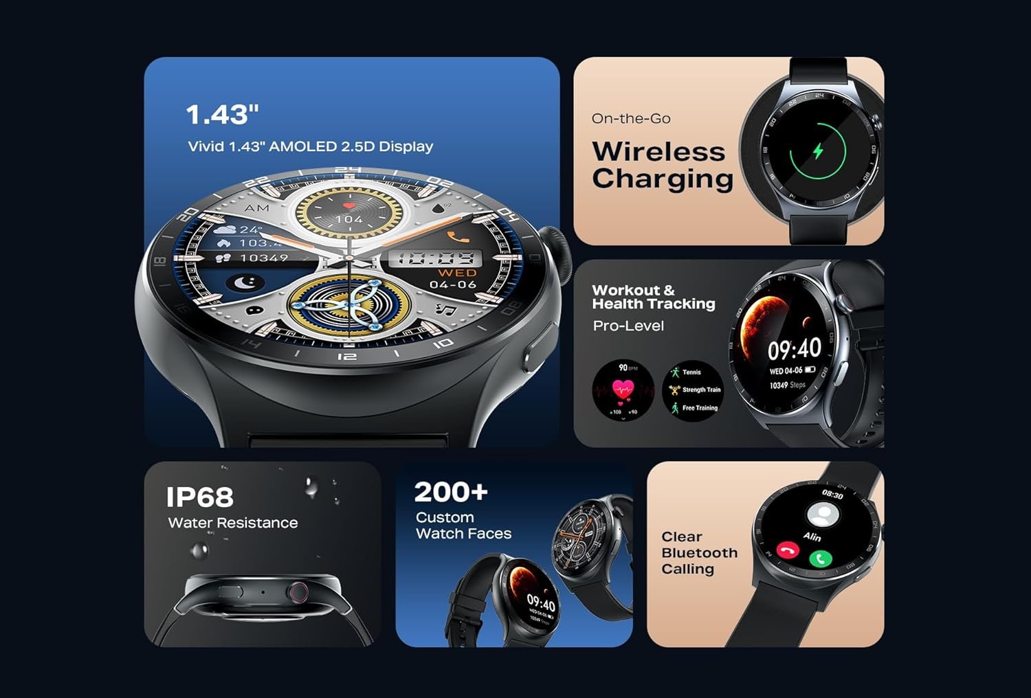 شاشة AMOLED قياس 1.43 بوصة بدقة 466×466 بكسل مع دعم عرض دائم Always‑On Display (AOD) لعرض الوقت والمعلومات بدون الضغط على الشاشة.